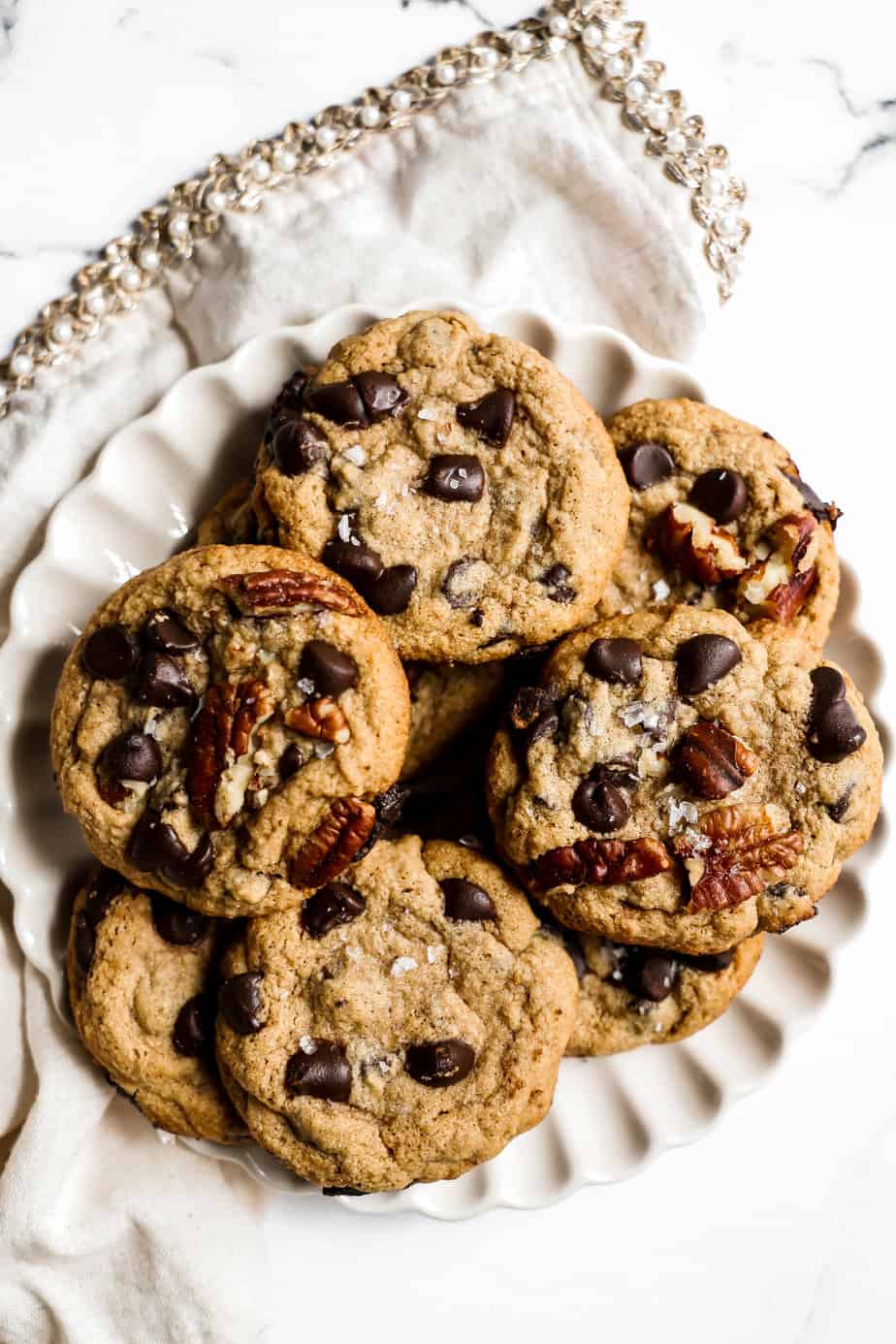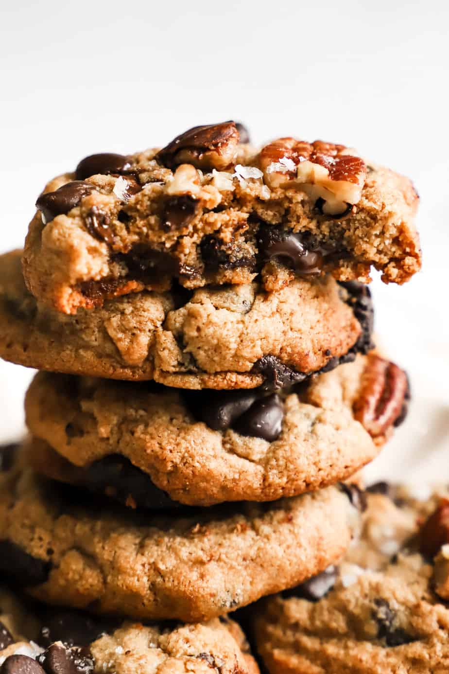 These deliciously soft healthier almond flour cookies are a dream, and I mean that. Dark chocolate chips and pecans mixed in, plus some flaky sea salt on top are chef's kiss! They melt in your mouth and leave you with no guilt (although you should not ever feel that anyways - because balance!)