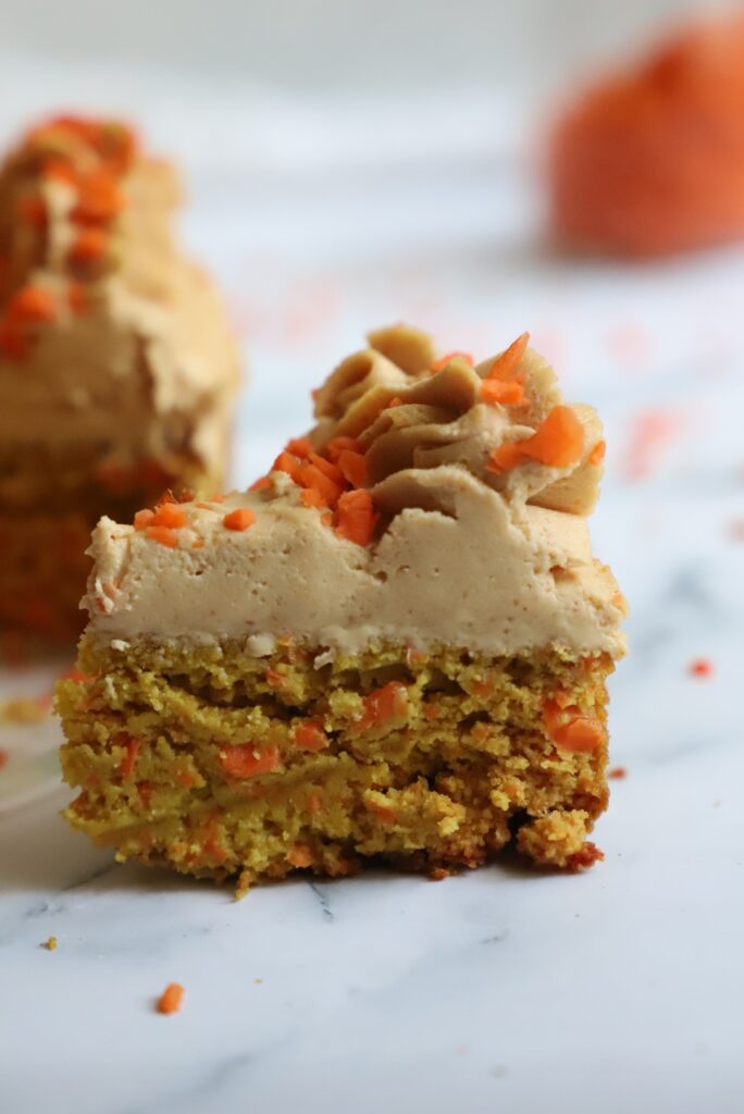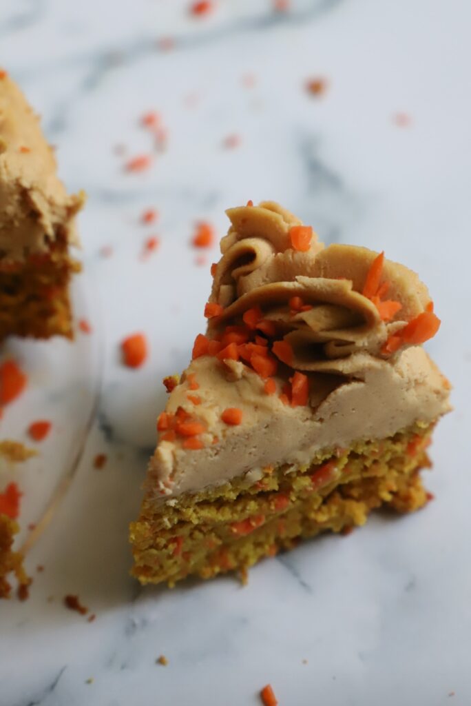 - Spread the dog frosting evenly on the cooled cake. Additionally, put some frosting in a piping bag fitted with a star piping tip and pipe a decorate border or swirls on the cake. Top with remaining shredded carrots or dog safe toppings if desired. Slice individual servings (size appropriately for your own individual dog) and enjoy!