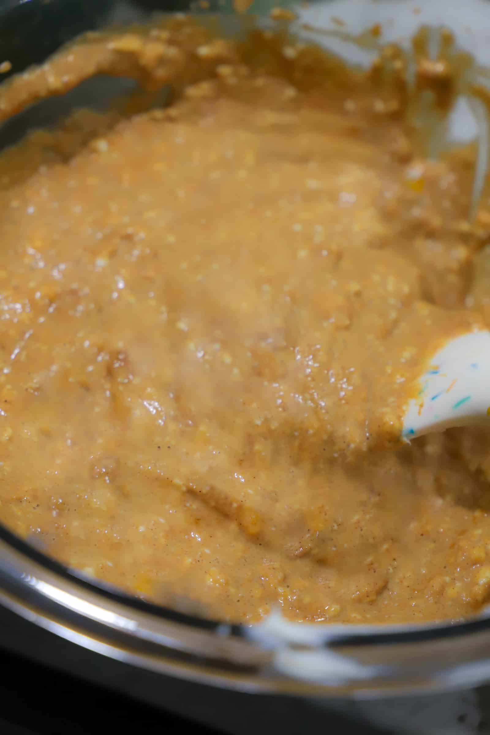 Step 7: With an electric mixer, beat together the softened cream cheese, sugar, pumpkin pie spice, and vanilla extract. Once combined, continue to mix in the egg and pumpkin until a smooth uniform cheesecake mixture forms.