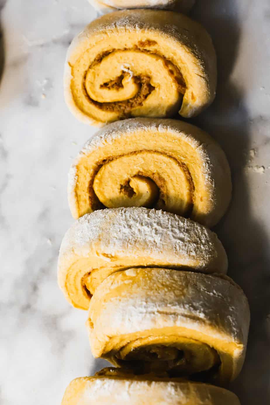 With unscented clean dental floss, slice the soft pumpkin cinnamon roll dough log evenly.